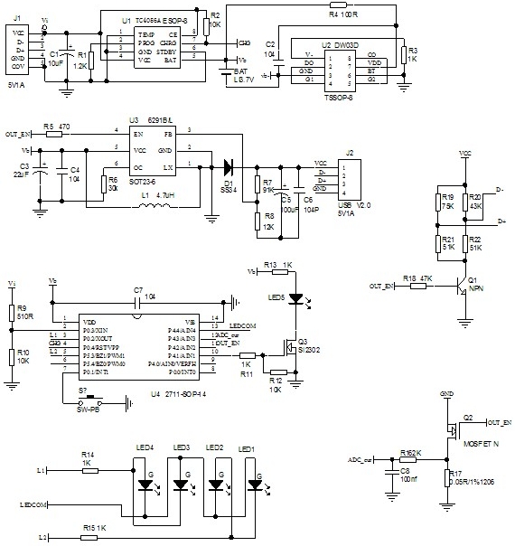 當輸入電壓(交流適配器或 USB 電源)被拿掉時,TC4056A 自動進入一個低電流狀態,將電池漏電流降至2uA 以下。TC4056A 在有電源時也可置于停機模式,以而將供電電流降至 55uA。TC4056A 的其他特點包括電池溫度檢測、欠壓閉鎖、自動再充電和兩個用于指示充電、結束的 LED 狀態引腳。
