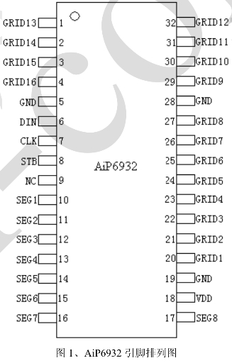 AiP6932是一款由無錫中微愛芯電子有限公司生產的3線串口共陰極8段16位LED驅動控制專用電路。這款芯片在LED顯示面板場合有著廣泛的應用,如電磁爐、電飯煲、空調、機頂盒等家電產品的顯示。本文將詳細介紹AiP6932的引腳功能,為工程師和設計師提供全面的技術參考。