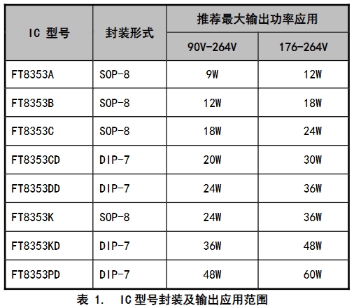 • FT8353KD:DIP-7封裝,推薦最大輸出功率達到36W,在176-264V輸入電壓下,適用于高功率LED照明產(chǎn)品,如大功率LED投光燈、T8燈管等。