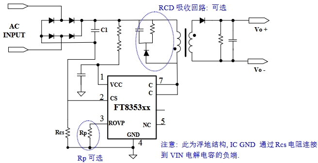 在該電路中,AC輸入電壓經(jīng)過整流濾波后,為FT8353xx芯片供電。VCC腳接收供電電壓,CS腳通過Rcs電阻采樣電感電流,實現(xiàn)恒流控制。ROVP腳根據(jù)需要設(shè)置輸出過壓保護。GND腳連接到VIN電解電容負端,為芯片提供穩(wěn)定的參考地。C腳與變壓器相連,將功率傳輸?shù)酱渭墏?cè),為LED負載提供驅(qū)動電壓和電流。此外,電路中還可選配RCD吸收回路,用于抑制變壓器漏感引起的電壓尖峰,保護芯片和電路的穩(wěn)定運行。