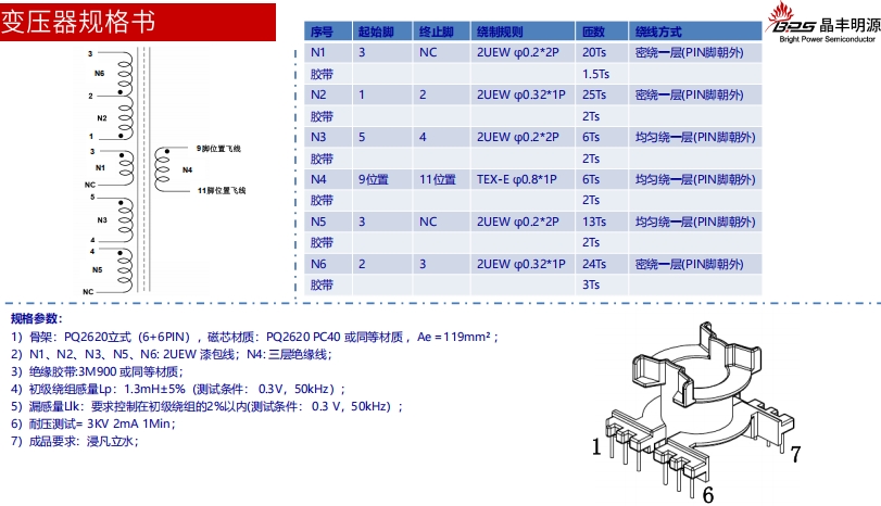 骨架:PQ2620立式(6+6PIN),磁芯材質(zhì):PQ2620 PC40或同等材質(zhì),Ae=119mm2