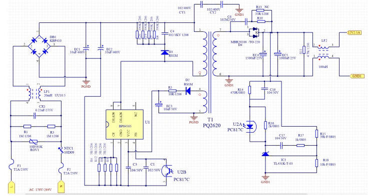 主控芯片:U1(BP84505BP)是核心控制芯片,負(fù)責(zé)PWM控制和保護(hù)功能。