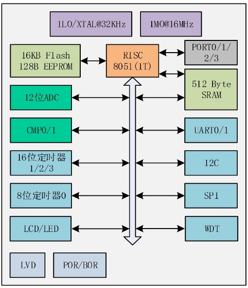采用1T 8051內(nèi)核,時(shí)鐘頻率最高可達(dá)33MHz,同時(shí)具備低功耗模式,動(dòng)態(tài)功耗低至0.18mA/MHz。