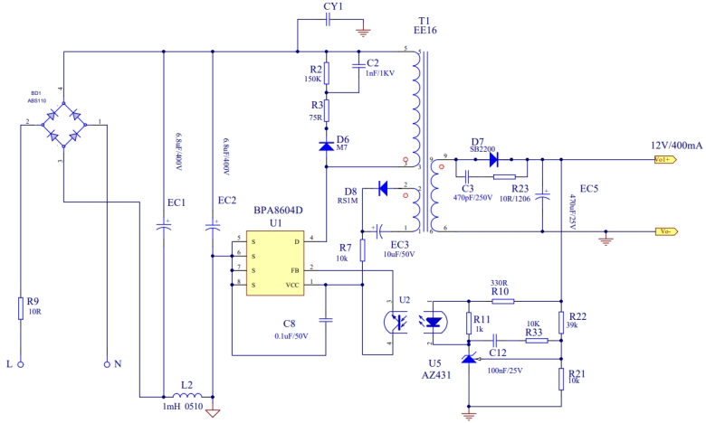 BPA8604D的電路設(shè)計(jì)簡(jiǎn)潔而高效,充分體現(xiàn)了其高度集成化的特點(diǎn)。從電路圖中可以看出,整個(gè)電源電路主要由輸入濾波、整流橋、變壓器、反饋電路和輸出濾波等部分組成。輸入濾波部分采用了電解電容和貼片電容的組合,能夠有效濾除輸入電壓中的高頻噪聲,為后續(xù)電路提供穩(wěn)定的輸入電壓。