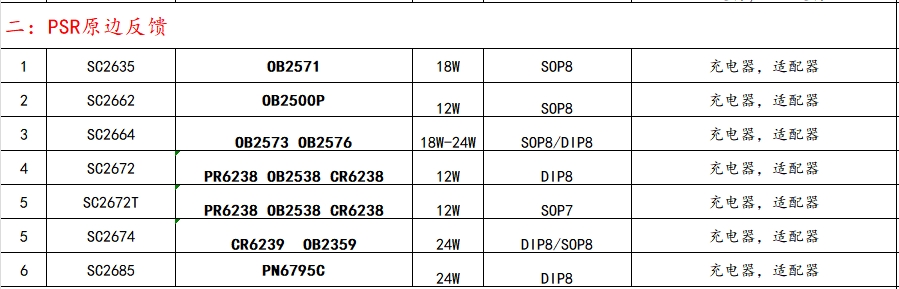 PSR(Primary Side Regulation)原邊反饋系列是鼎芯微電子推出的一類高效電源管理芯片,適用于充電器、適配器等應用場景。以下是該系列部分型號及其替代型號: