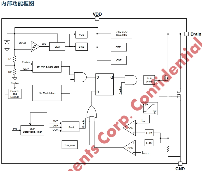 當輸入高壓直流電時,KP328X內部的高壓啟動電路開始工作,從Drain端取電并通過高壓電流源對VDD電容進行充電。當VDD電壓上升至VDD_ON時,芯片開始工作。