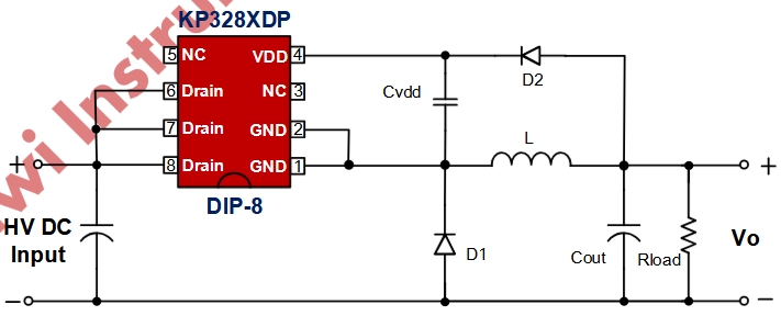 在該電路中,HV DC Input為高壓直流輸入端,Vo為輸出電壓端,Drain為內部高壓MOSFET的漏極,GND為參考地。Cvdd為VDD腳的濾波電容,推薦采用1uF陶瓷電容;L為電感,用于儲能和濾波;D1和D2為二極管,用于整流和續流;Cout為輸出濾波電容,用于平滑輸出電壓;Rload為負載電阻,代表實際應用中的負載設備。