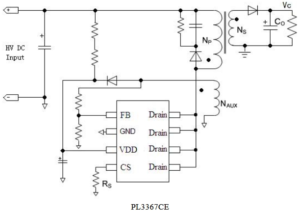 PL3367CE具有低啟動電流,可以采用大的啟動電阻以及小的VDD電容以降低應用中的功率損耗。其工作電流很低,再加上特有的復合模式控制,從而提高了系統的效率,特別是系統處于輕載條件下。