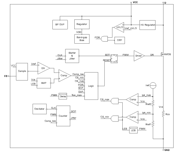 | 1/2 | GND | 芯片地,同時也是集成高壓MOSFET的源極 |