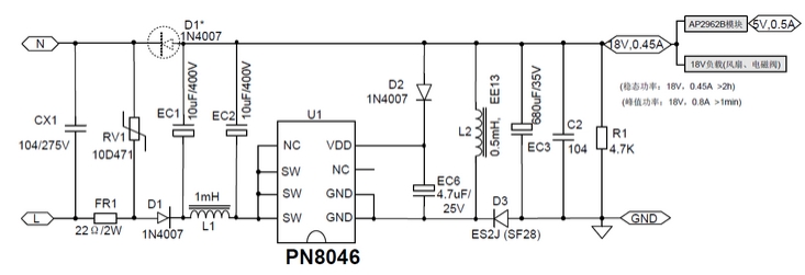 18V0.45A智能家電電源經典芯片及方案(PN8046的應用與優勢)