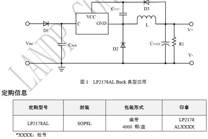 LP2178AL是一款高效率、高精度的非隔離降壓開(kāi)關(guān)電源恒壓控制驅(qū)動(dòng)芯片,其內(nèi)部集成高壓功率管,采用恒壓控制模式,系統(tǒng)可工作于CCM和DCM模式。采用特有的PFM控制方式,改善音頻特性。外圍應(yīng)用簡(jiǎn)單,可靠性強(qiáng)。典型應(yīng)用圖如下所示