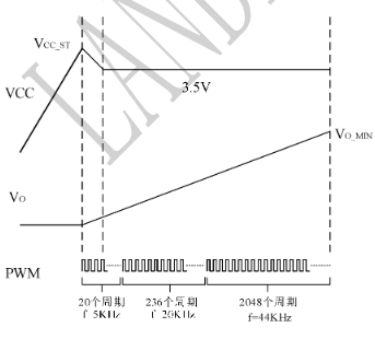 通過(guò)啟動(dòng)電路給VCC電容充電,VCC達(dá)到啟動(dòng)電壓VCC_ST,芯片輸出PWM開(kāi)關(guān)信號(hào)。此時(shí)輸出電壓開(kāi)始上升,因輸出電壓還小,VCC電壓會(huì)下降到3.5V,VCC通過(guò)自供電維持在3.5V。PWM開(kāi)關(guān)信號(hào)經(jīng)過(guò)以下3個(gè)階段,軟啟動(dòng)結(jié)束。軟啟動(dòng)結(jié)束時(shí),輸出電壓上升到VO_MIN:若VO_MIN>3.5V,芯片正常工作;若VO_MIN<3.5V,芯片輸出短路保護(hù)。