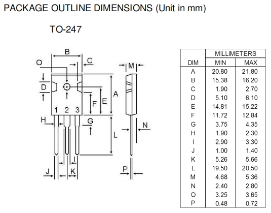 2SA1943采用了TO-247封裝形式,這種封裝形式具有良好的散熱性能和較高的電流承載能力。TO-247封裝通常包括一個較大的集電極引腳,用于連接散熱器,從而能夠有效地將晶體管工作時產生的熱量散發出去,確保晶體管在高功率工作時的穩定性。其封裝尺寸為20.80mm×16.20mm×5.38mm,這種尺寸使得它能夠方便地安裝在各種電路板上,并且可以與其他電子元件進行良好的配合。