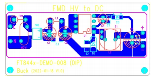 以下是基于 FT8443BD2 的 18V500mA 恒壓輸出電源的 PCB 布局示意圖。元件分布合理,走線清晰,便于生產(chǎn)和調(diào)試。