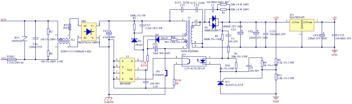 在主電路部分,BPA861AP芯片通過集成的高壓MOSFET實現(xiàn)開關(guān)功能,將輸入的交流電轉(zhuǎn)換為高頻脈沖信號,再經(jīng)過變壓器進(jìn)行隔離和降壓,最終通過整流濾波電路輸出穩(wěn)定的12V直流電壓。光耦和TL431組成的反饋電路能夠?qū)崟r監(jiān)測輸出電壓的變化,并將反饋信號傳遞給BPA861AP芯片,從而實現(xiàn)對輸出電壓的精確調(diào)節(jié)。