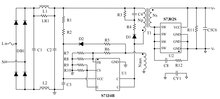 S7134B芯片的電路原理圖是其參考設(shè)計(jì)的核心部分,它詳細(xì)展示了芯片如何與其他電子元件協(xié)同工作,以實(shí)現(xiàn)恒壓恒流的電源輸出。以下是電路原理圖的簡要說明: