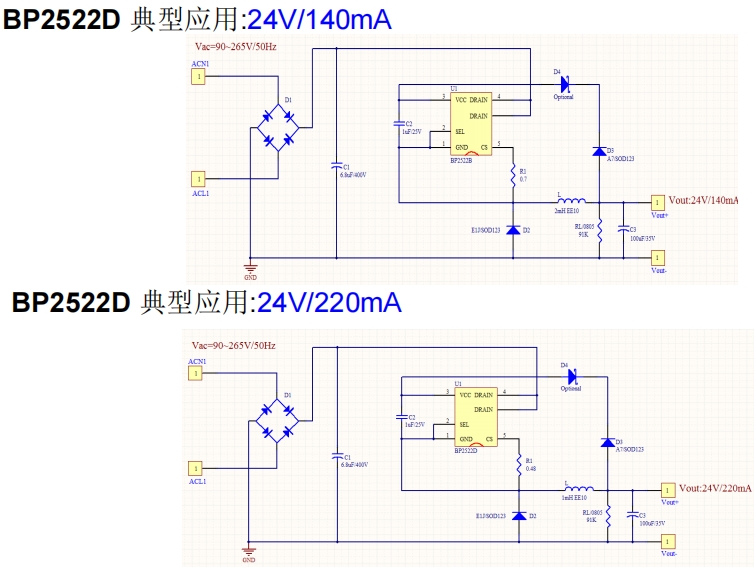 BP2522D在24V/220mA應用中的典型電路如下: