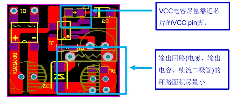 2. 輸出回路(電感、輸出電容、續(xù)流二極管)的環(huán)路面積應盡量小,以降低寄生電感和電阻,減少電磁干擾。