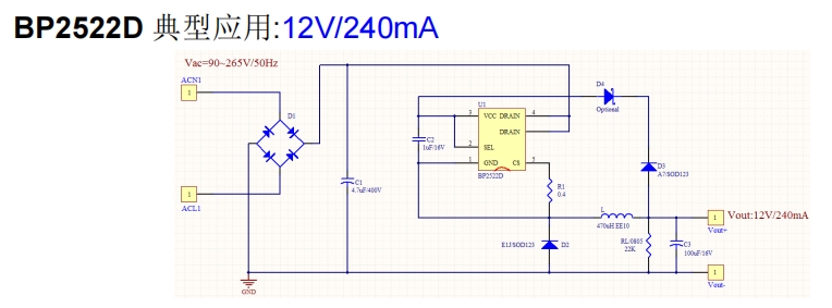 BP2522D在12V/240mA應用中的典型電路如下: