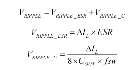 輸出電容的選擇對輸出電壓紋波、系統(tǒng)動態(tài)響應、環(huán)路穩(wěn)定性、輸出電壓過沖等有直接影響。在恒定輸出電流的CV模式下,輸出紋波主要由輸出電容的等效串聯(lián)電阻(ESR)和容量決定。紋波計算公式為: