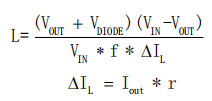 BP2522D可工作于連續(xù)導通模式(CCM)、不連續(xù)導通模式(DCM)等多種模式。電感選擇需綜合考慮感量、峰值電流和平均電流。小感量電感能減小尺寸、降低成本并改善動態(tài)響應,但會增大峰值電流和輸出紋波,降低系統(tǒng)效率。大感量電感可提高效率,但尺寸較大,動態(tài)響應較慢。實際應用中,需綜合考慮動態(tài)響應、電感尺寸、效率、實際帶載電流和芯片溫升等因素,選擇合適的電感。電感計算公式為: