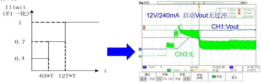 BP2522D具備軟啟動功能,通過分段增加峰值電流來減小開關應力,避免輸出電壓過沖現(xiàn)象。軟啟動分為三個階段:第一階段Ipk1=0.4Ilimit,第二階段Ipk2=0.7Ilimit,第三階段Ipk3等于設置的Ilimit。在重載下啟動時,系統(tǒng)會觸發(fā)降頻模式,工作頻率降為滿載的1/4。