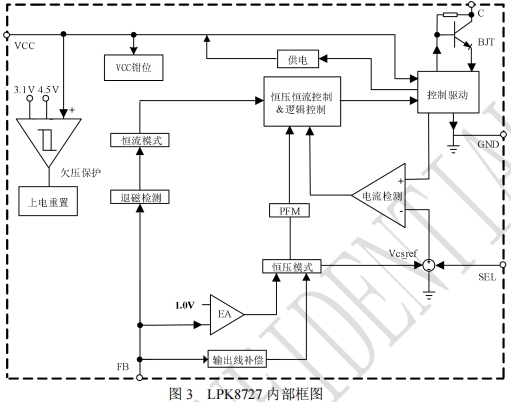 LPK8727僅需1uA的啟動電流。系統上電后,通過內部啟動電路給Vcc的電容充電,當Vcc電壓達到芯片開啟閾值時,芯片內部控制電路開始工作。系統啟動后,Vcc由內部專有的供電電路進行供電。