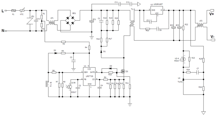 1. 原邊電路:LP8773S直接驅(qū)動MOSFET,無需光耦反饋,節(jié)省1顆光耦+TL431。