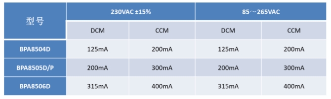 輸出電流:在230VAC±15%條件下,可提供200mA(DCM)和300mA(CCM)的輸出;在85~265VAC條件下,提供200mA(DCM)和300mA(CCM)。