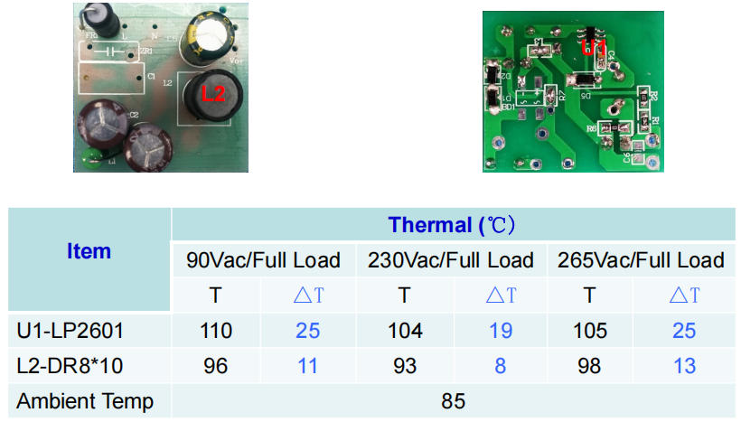 U1 表面 92 ℃,L1 85 ℃,FR1 78 ℃,全部 < 120 ℃ 降額限值