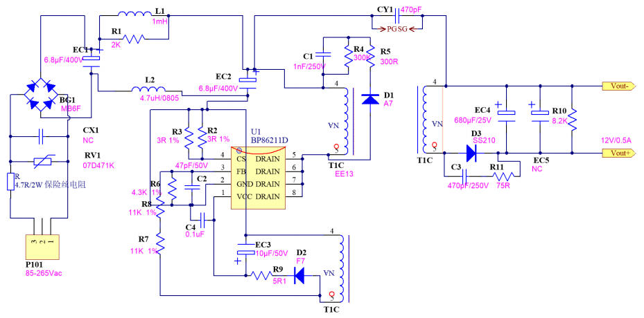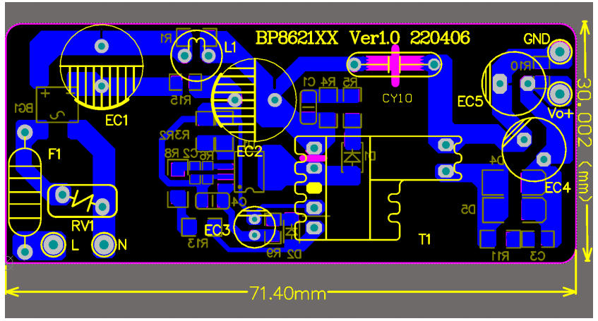 在 5 W-10 W 功率段的家電輔助電源里,工程師最想要的是:省器件、低成本、一次過 EMI、馬上能量產(chǎn)。深圳三佛科技提供的 BP86211D 參考設(shè)計,用 單顆 SOP-7 芯片 + 650 V 集成 MOSFET,官方實測 12 V/0.5 A(6 W),待機功耗 < 65 mW,BOM 僅 24 顆器件,單面板即可過 CISPR22 Class B 傳導。本文帶你從特點、電路圖、實物、BOM、變壓器到測試數(shù)據(jù),完整拆解這套“家用電器即插即用級”方案。