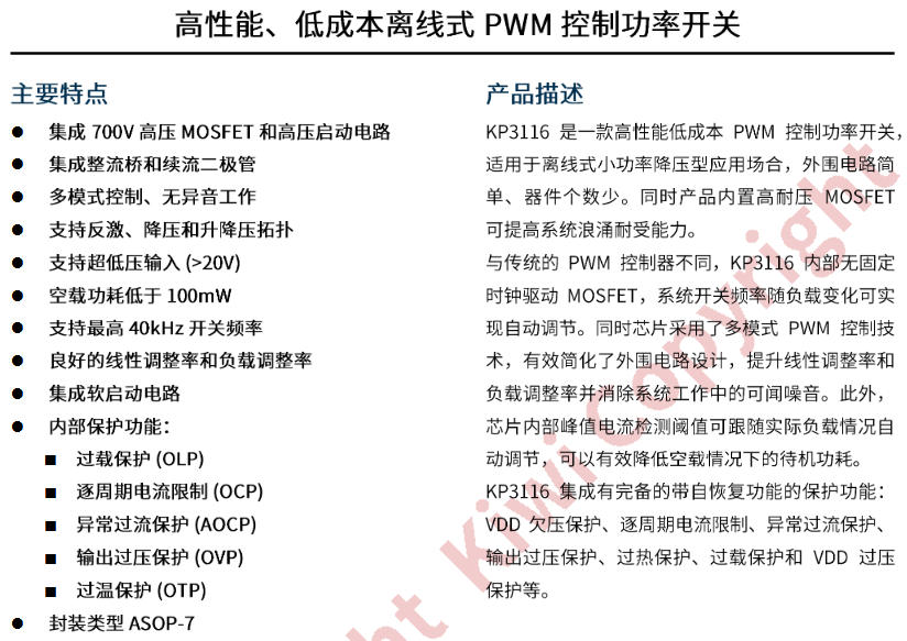 KP3116WPA 把“高壓 MOS + 高壓啟動 + 多模式 PWM”一口氣塞進 SOP-7,外圍僅 8 顆料,空載 <100 mW,系統成本 <0.45 元,PCB 1 cm2 搞定??赐赀@篇,你會明白什么叫“一粒米”電源。