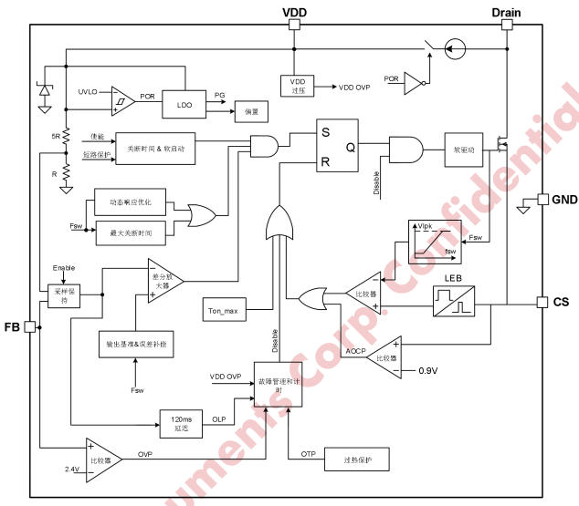 | 1 | VDD | P | 芯片供電 7.5 V 啟動(dòng),同時(shí)兼反饋采樣 |