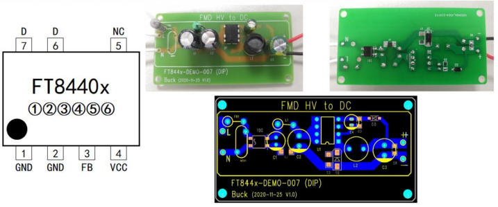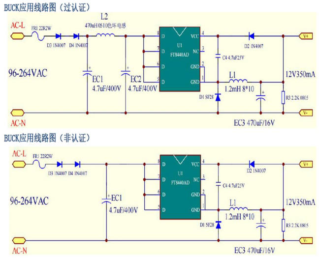 FT8440AD 支持 Buck 與 Buck-Boost 雙拓?fù)洌惶?BOM 只需改 2 個(gè)器件即可切換,方便一張 PCB 兼容 110 V 與 220 V 市場(chǎng)。