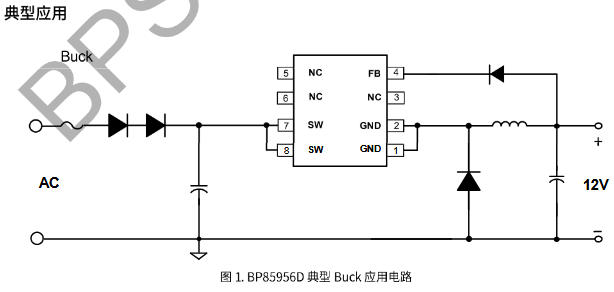 SOP-8封裝,絲印“BP85956D”下面還有一行小字“YYWWX”,內(nèi)部批次碼。管腳定義如下(頂視圖逆時(shí)針):