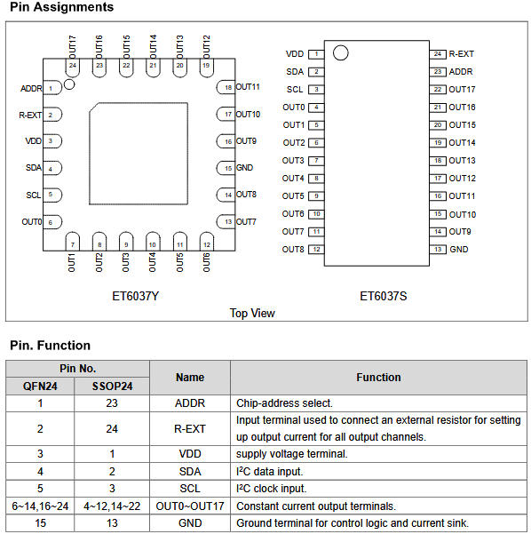 ET6037S 把「18 路恒流源 + 128 級 PWM + I2C 四地址 + RGB 分組」濃縮進 4×4mm 的 QFN24 或 SSOP24: