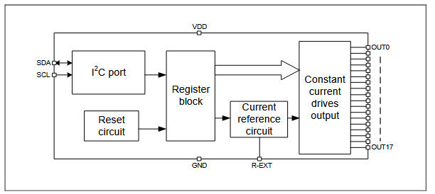 下圖展現了一顆「恒流源陣列 + I2C 控制器」的架構: