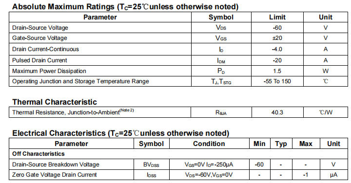 | RDS(ON) | VGS=-10V, ID=-1A | 80mΩ | 滿載4A時導通壓降僅320mV,功耗1.28W |