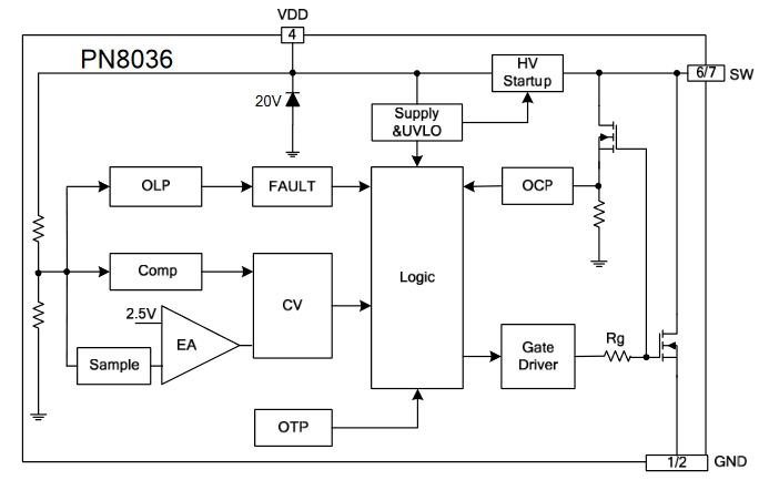 PN8036寬輸出范圍非隔離交直流轉換芯片 ,集成PFM控制器及650V高雪崩能力智能功率MOSFET,用于外圍元器件極精簡的小功率非隔離開關電源。PN8036內置650V高壓啟動模塊,實現系統快速啟動、超低待機功能。該芯片提供了完整的智能化保護功能,包括過流保護,欠壓保護,過溫保護,另外PN8036的降頻調制技術有助于改善EMI特性。、
