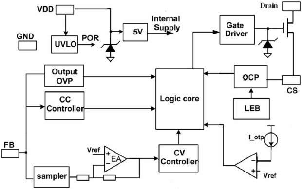 PL3325C 同時具有多種保護(hù)功能:逐周期峰值電流檢測、欠壓保護(hù)、過壓保護(hù)等。內(nèi)部框架圖如下所示