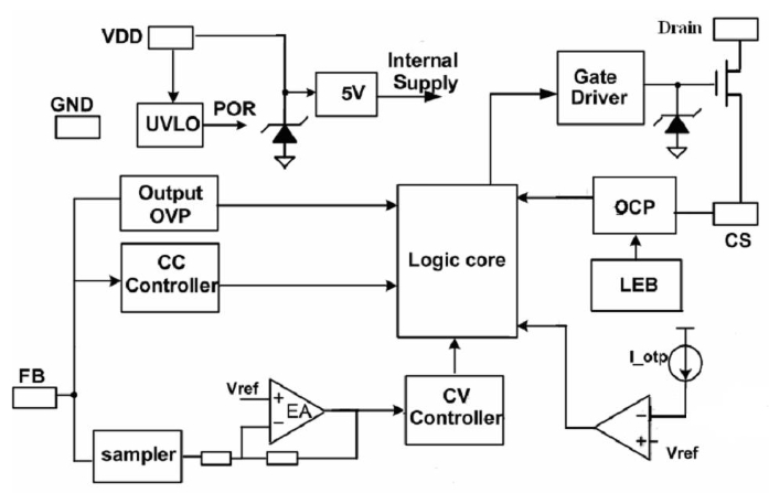 PL3326CS 是一系列高效率、高集成度、原邊調(diào)節(jié)的 PWM功率開關(guān),其主要應(yīng)用于小于 15W 的 AC/DC 反激式開關(guān)電源。PL3326C 通過去除光耦以及次級控制電路,簡化了充電器/適配器等傳統(tǒng)的恒流/恒壓的設(shè)計,從而實(shí)現(xiàn)高精度的電壓和電流調(diào)節(jié),內(nèi)部框架圖如下所示