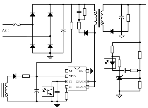 芯片通過對輸出采樣并反饋到光耦獲得高精度的恒壓輸出。內(nèi)置的斜率補(bǔ)償電路確保了峰值電流模控制的穩(wěn)定性。內(nèi)部集成的頻率抖動(dòng)功能可以改善EMC,降低EMI濾波成本。