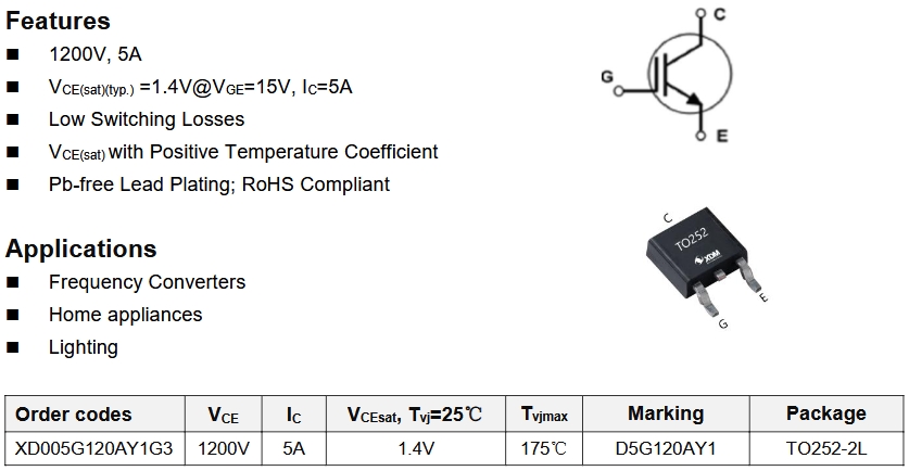 XD005G120AY1G3以其5A的電流等級,適用于較低功率的充電槍。它的1200V電壓等級確保了在高電壓充電場景下的安全性。T0-252-3L封裝類型提供了良好的散熱性能,適合于充電槍的緊湊設計。