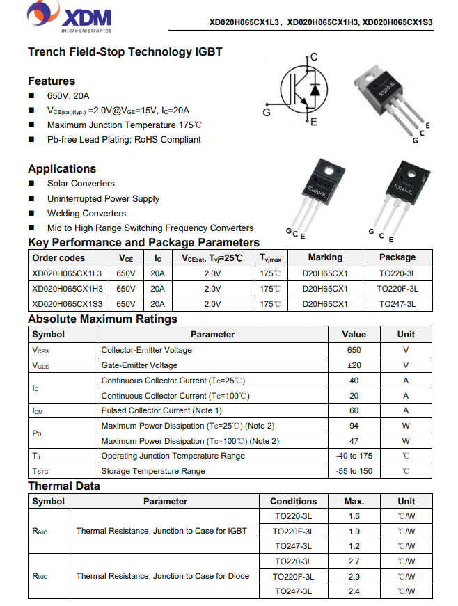 XD020H065CX1H3芯達(dá)茂國產(chǎn)IBGT +FRD單管 20A 650V TO-220F