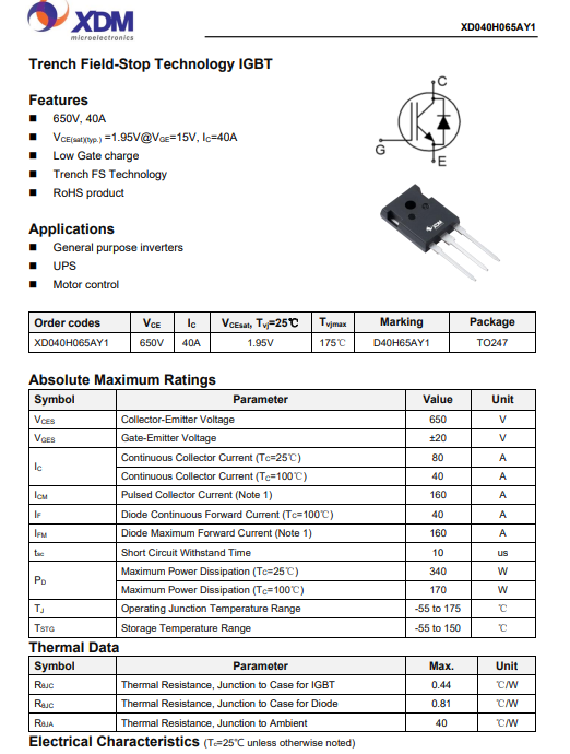 芯達茂XD040H065AY1S3國產IBGT +FRD單管 40A 650V TO-247-3L