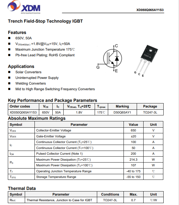 芯達茂XD050Q065AY1S3國產IBGT +FRD單管 50A 650V TO-247-3L