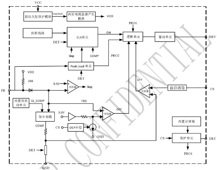 軟啟動功能:LP8776CD內(nèi)置典型值9mS的軟啟動功能,通過在啟動階段逐周期增加VCS保護(hù)閾值的方式實(shí)現(xiàn),有利于避免變壓器的飽和和降低副邊二極管的應(yīng)力,從而提高耐壓性能。
